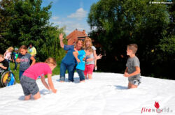 Nach einer kleinen Stärkung durften die Kleinen einen Schaumteppich legen und die verschiedenen Strahlrohrarten ausprobieren. Natürlich durfte auch ein Wettspritzen mit den Kübelspritzen nicht fehlen, bevor es mit einer kurzen Vorführung der verschiedenen technischen Geräte der Feuerwehrfahrzeuge weiterging.
