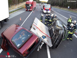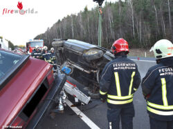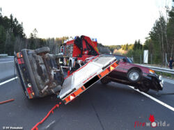PINKAFELD (BGLD): Am Abend des 29.03.2017 wurde die Feuerwehr der Stadt Pinkafeld zu einer Fahrzeugbergung nach einem Verkehrsunfall auf die A2 (Südautobahn) alarmiert. Ein mit einem Auto beladenes Pkw-Anhängergespann war in Fahrtrichtung Wien ins Schleudern geraten, touchierte dabei die Betonmittelleitschiene, stürzte auf die Seite und kam quer über die Autobahn zum Liegen.