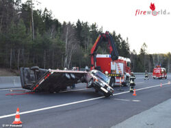 Verletzt wurde bei dem Crash niemand. Bei dem Unfall wurde auch der Pkw der am Anhänger geladen war heruntergeschleudert. Die Feuerwehr Pinkafeld sicherte die Unfallstelle ab, stellte den Brandschutz sicher und führte mittels SRF und WLF die Bergung durch. Auch ausgeflossenes Öl wurde gebunden und die Fahrbahn gereinigt. Nach zwei Stunden konnte wieder eingerückt werden.