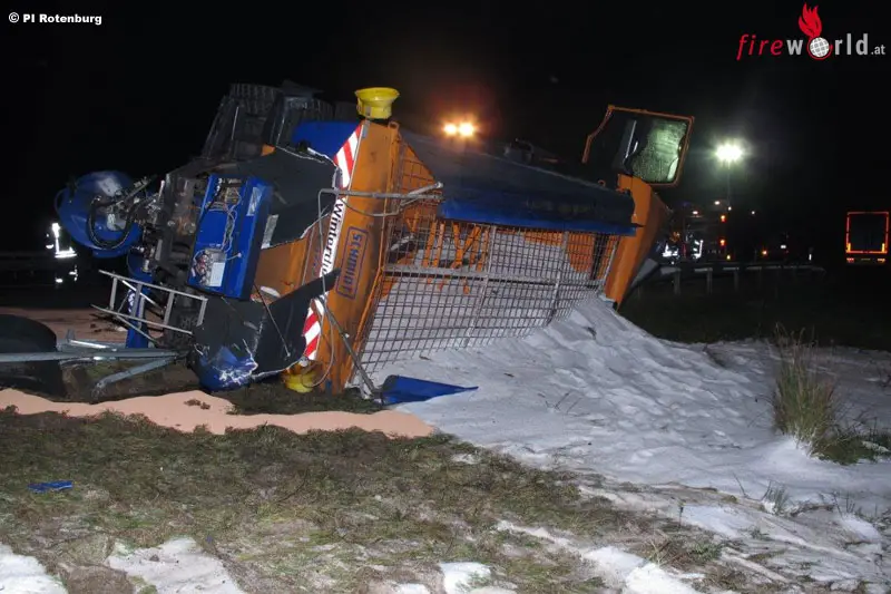 GYHUM (DEUTSCHLAND): Am frühen Freitagmorgen, 27. November 2015, hat ein außergewöhnlicher Verkehrsunfall auf der A1 in Richtung Bremen bei Gyhum für erhebliche Verkehrsbehinderungen gesorgt. Ein 31-jähriger Kraftfahrer aus dem Wendland hatte gegen 03.20 Uhr die Geschwindigkeit eines vor ihm fahrenden Streufahrzeuges, das bei den winterlichen Verhältnissen für Sicherheit auf der A1 sorgen sollte, unterschätzt.