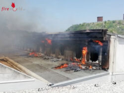 Parallel dazu wurde ein Außenangriff gestartet und ein eigener Einsatzabschnitt am Dach gebildet, da auch hier bereits der Brand übergegriffen hat. Die Dachverkleidung wurde teilweise unter Atemschutz mittels Rettungssägen sowie Trennschleifern geöffnet, damit auch der Löschangriff über das Dach die gewünschte Wirkung erzielte. Aufgrund der Größe des Brandraumes sowie des verwinkelten Zugangs, wurden ebenfalls drei Druckbelüfter in Stellung gebracht, um die Sichtverhältnisse für die eingesetzten Trupps im Innenangriff zu erleichtern.