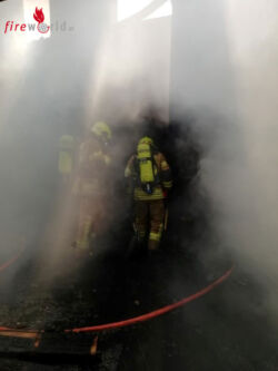 Nur zehn Minuten nach der Alarmierung wurde unter Atemschutz ein Innenangriff Richtung Schießstand gestartet. Die Löscharbeiten gestalteten sich im ersten Moment durch die enorme Rauchentwicklung der brennenden Dämmstoffe schwierig. Besondere Vorsicht war geboten, da sich der erste Angriffstrupp unter Nullsicht und enormer Hitzentwicklung Richtung Brandherd vorkämpfen musste, wobei zu diesem Zeitpunkt nicht ausgeschlossen werden konnte, dass sich Munition oder Munitionsteile im Gebäude befinden. Von den weiteren eintreffenden Tank- und Rüstlöschfahrzeugen wurde die Wasserversorgung sichergestellt und weitere Atemschutztrupps gestellt.