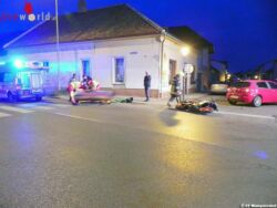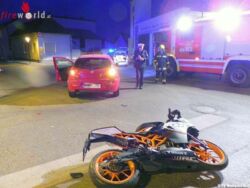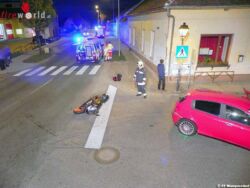 Bei Eintreffen des erstankommenden Rüstlöschfahrzeuges der FF Wampersdorf bat sich den Einsatzkräften folgendes Bild: Das verunfallte Motorrad lag beschädigt im Kreuzungsbereich, ein am Heck beschädigter Pkw stand unmittelbar dahinter.