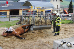 ALTENBERG (OÖ): In Altenberg bei Linz ist am 12. April 2017 ein Pferd so unglücklich mit den Hinterbeinen in eine Futterbox geraten, dass es stecken blieb. Der Besitzer schaffte es nicht, den Wallach wieder zu befreien und alarmierte die Feuerwehr.