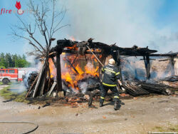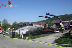 Die umliegenden Gebäude, darunter das Wohnhaus konnten mit diesen Maßnahmen vor einem Brandübergriff gerettet werden. Das Wirtschaftsgebäude wurde jedoch komplett zerstört. Mit Hilfe von einem Feuerwehreinsatzfahrzeug mit einem Greifer wurden in der Folge absturzgefährliche Bauteile vom Gebäude abgetragen und das Brandgut auseinander geteilt. „Brand aus!“ konnte um 19.12 Uhr gegeben werden.