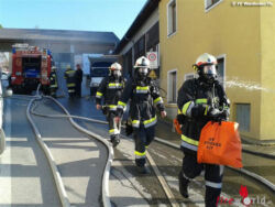 Noch während der Anfahrt rüstete sich ein Trupp im Tanklöschfahrzeug 1 mit umluftunabhängigen Atemschutz aus. So konnte sofort nach dem Eintreffen am Übungsort mit der Personensuche im stark verrauchten Brandobjekt begonnen werden. Weitere Atemschutztrupps der beteiligten Feuerwehren unterstützten die Personensuche. So konnten die beiden vermissten Personen rasch gefunden und ins Freie gerettet werden. Zeitgleich wurden die Vorbereitungen für die Brandbekämpfung und Schützen der Nachbarobjekte getroffen und bereits Minuten später mit mehreren Strahlrohren begonnen. In der Erstphase wurde das Löschwasser von den beiden Tanklöschfahrzeugen der Feuerwehren Altwaidhofen und Waidhofen/Thaya entnommen. Nachrückende Feuerwehrkräfte errichteten zwei Zubringerleitungen aus der nahe gelegenen Thaya und stellten so die Löschwasserversorgung für die beiden Tanklöschfahrzeuge sicher. Nachdem der "Brand" gelöscht war, wurde das Brandobjekt mittel Druckbelüfter des Tanklöschfahrzeuges 1 wieder rauchfrei gemacht.