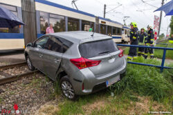 Der Lenker eines Pkws übersah beim Überqueren eines unbeschrankten Bahnüberganges der Badener Bahn eine herankommende Zugsgarnitur. Das Fahrzeug wurde im Heckbereich erfasst und zur Seite geschleudert. Dabei drehte sich der Pkw um die eigene Achse und prallte dann auch noch mit der rechten Fahrzeugheckseite gegen ein Geländer, bevor dieser quer auf einem der beiden Geleise stehend zum Stillstand kam. Zum Glück wurde bei dem Vorfall niemand verletzt. Am Pkw entstand jedoch beträchtlicher Sachschaden.