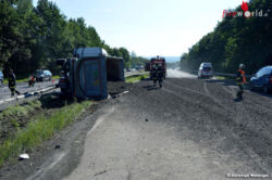 ENGERWITZDORF (OÖ): Ein Reifenplatzer bei einem Lkw hat Samstagvormittag, 30. Juli 2016, einen schweren Verkehrsunfall auf der Mühlkreisautobahn (A7) im Gemeindegebiet von Engerwitzdorf ausgelöst. Der Lkw-Lenker krachte mit einem Pkw zusammen und anschließend in die Leitschienen. Daraufhin kippte der Anhänger um und verteilte 26 Tonnen Schotter auf allen Fahrstreifen der A7.