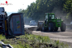 "Der Schotter war über 60 Meter auf der Autobahn verteilt und der Lkw selbst war in den Leitschienen völlig verkeilt. Wir forderten ein Lkw-Bergeunternehmen an", schilderte Einsatzleiter Christoph Schwarz die Lage. Der Schotter wurde von der FF Treffling in Zusammenarbeit mit einem Landwirt und einem Radlader aufgeschaufelt.