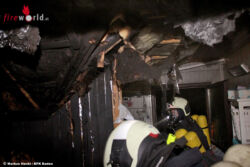 Wenige Zeit später erreichten die ersten Einsatzkräfte das Einfamilienhaus, kurz vor Ortsende von Neusiedl. Rauchschwaden drangen bereits aus dem Dach. Sofort wurde ein Innenangriff unter Atemschutz ins Gebäude gestartet. Aus dem Badezimmer im Dachgeschoß schlugen ihnen schon die Flammen entgegen. Innerhalb kürzester Zeit konnte der Brand, mit gezielten Wasserstößen aus dem Strahlrohr, unter Kontrolle gebracht werden. Um versteckte Glutnester zu erreichen, die sich in die Dachkonstruktion ausgebreitet hatten, musste die Verkleidung teilweise entfernt werden. Auch diese Brandherde konnten rasch abgelöscht werden.