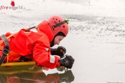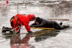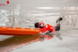 Nun hatten alle Übungsteilnehmer die Möglichkeit, verschiedenste Rettungsmittel (Spineboard oder Korbtrage) und die Überlebensanzüge zu testen. Ebenfalls wurden auch Möglichkeiten zur Selbstrettung geschult. Sollte es die Lage erlauben kann natürlich auch die Drehleiter zum Einsatz kommen. Hier wurden ebenfalls mehrere Methoden probiert um Eingebrochene rasch zu retten.