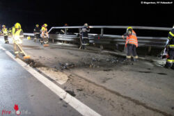 Das Fahrzeug blieb anschließend stark beschädigt auf der rechten Fahrspur stehen. Beim Eintreffen der Feuerwehren versorgte das Rote Kreuz bereits den Verletzten. Nach Freigabe der Unfallstelle durch die anwesende Polizei sammelten die Helfer herumliegende Trümmerteile ein, banden ausgeflossene Betriebsmittel und halfen bei der Fahrzeugbergung.
