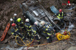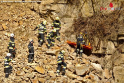 Das Szenario mit der verunglückten Wandergruppe erforderte ebenfalls viel Vorarbeit und Sorgfalt. Die MR-AS Trupps der FF Frauental und Blumegg-Teipl begannen umgehend damit gesicherte Abstiege in die hohe und senkrecht abfallende Felswand zu schaffen um die Verletzten zu retten. Die Personen wurden dabei in Schleifkorbtragen gelegt und anschließend zum Sanitätsplatz transportiert. Unterstützung erhielten Sie von den Kameraden der FF Stallhof, Ettendorf und Rossegg. Als Abschnittseinsatzleiter fungierten hier Abschnittssanitätsbeauftragte HLM d. S. Stefanie Gollob und HBM Mag. Wolfgang Gaich (beide FF Stainz). Als alle Personen gerettet und dem Rettungsdienst übergeben wurden, konnte mit dem Rückbau begonnen werden. Zum Schluss wurde noch das Unfallfahrzeug mit der Seilwinde aus dem ca. 50m tiefen Abhang gezogen und zum Abtransport bereitgestellt.