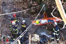 Die MR-AS Gruppe der Feuerwehr Wald unterstützte anschließend die Gruppe der FF Pirkhof und Stainz, die Koordination übernahm hier Abschnittseinsatzleiter HBM Thomas Klug (FF Pirkhof). Zuerst wurde der PKW gesichert und nachdem eine Seilbahn aufgebaut wurde, konnte anschließend mit der Rettung der darin befindlichen Personen begonnen werden. Mit Hilfe dieser Seilbahn konnten zunächst die ersten Personen schonend zurück auf die Straße gezogen bzw. gehoben werden. Auch das hydraulische Rettungsgerät wurde so an die Absturzstelle transportiert. Die eingesetzten Trupps konnten die beiden Personen rasch aus dem Auto befreien und ebenfalls mit Hilfe der Seilbahn zum SAN-Platz transportieren.