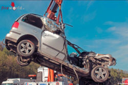 Nach dem Abtransport der Verletzten und der Freigabe der Unfallstelle durch die Polizei, wurde mit der Bergung der verstorbenen Person begonnen. Hierfür musste der PKW mittels Seilwinde des Rüstlöschfahrzeuges von dem Heck des Sattelzuges weggezogen werden um sich zum Eingeklemmten vorarbeiten zu können. Mittels hydraulischen Rettungsgerät wurde die deformierte Fahrgastzelle geöffnet und die Leiche aus dem Wrack geborgen.