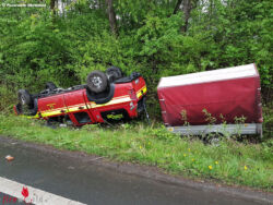 DORTMUND (DEUTSCHLAND): Am frühen Mittwochabend, 3. Mai 2017, ist gegen 18:30 Uhr ein Gerätewagen der Freiwilligen Feuerwehr bei einer Routinefahrt verunglückt. Die Insassen wurden dabei glücklicherweise nur leicht verletzt, wurden aber vorsorglich zur Kontrolle in ein Krankenhaus transportiert.