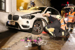 Beim Eintreffen an der Unfallstelle wurde der Einsatzbereich bereits durch die Polizei großräumig abgesichert und die Zufahrten der einbahnführenden Liechtensteinstraße gesperrt. Eines der beiden Unfallfahrzeuge konnte zwischenzeitlich schon von der Fahrbahn verbracht werden. Der beteiligte BMW-SUV musste allerdings erst, mittels zwei Wagenhebern, von der touchierten Hausmauer entfernt werden, um die notwendigen Rangierroller anzubringen. Im Anschluss konnte auch dieses Fahrzeug per Hand auf eine freie Parkfläche geschoben werden. Abschließend folgten Säuberungsarbeiten im verschmutzten Kreuzungsbereich, bevor die Einsatzmannschaft wieder ins Feuerwehrhaus einrücken konnte. Nach rund einer Stunde waren sämtliche Tätigkeiten abgeschlossen.
