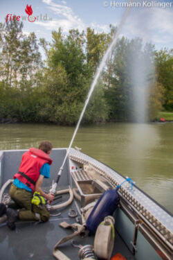 Im Anschluss daran erfolgte der Wechsel der Mannschaften der beiden aktiv teilnehmenden Wasserfahrzeuge (Arbeitsboot, Feuerwehrrettungsboot). Im Zuge der Fahrt stromaufwärts war das Arbeitsboot dann als fahrender Wasserwerfer unterwegs. In den wenigsten Fällen einsatzreal, aber das Arbeiten selbst erfüllte den gleichen Zweck sowie die entsprechende Übung.