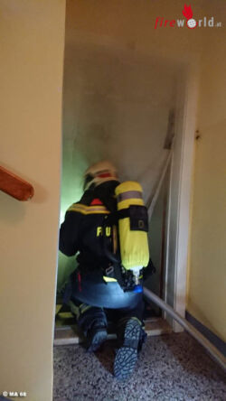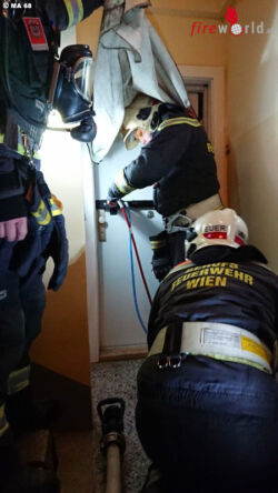 Bei einer genaueren Lageerkundung vor Ort wurde eine starke Erwärmung einer Wohnungstüre im 4. Stock festgestellt. Nach gewaltsamem Öffnen der Wohnungstüre wurde in der Wohnung eine leblose Person am Boden liegend vorgefunden und diese unverzüglich in einen gesicherten Bereich gebracht.
