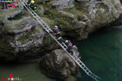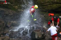 Die Rettungsaktion gestaltete sich schwierig. Die Retter mussten durch den Wasserfall, um zu dem Verletzten zu gelangen. Nach der Erstversorgung durch Rettungsdienst, dem Team des Notarzthubschraubers Martin 3 und der Feuerwehr wurde die aufwendige Rettungsaktion gestartet. Ein Schlauchboot wurde ins Wasser gelassen und der Verletzte so an eine Stelle gebracht, wo er über eine lange Leiter in der Schleiftrage nach oben gezogen werden konnte. Der Verletzte wurde mit dem Notarzthubschrauber ins Krankenhaus geflogen.