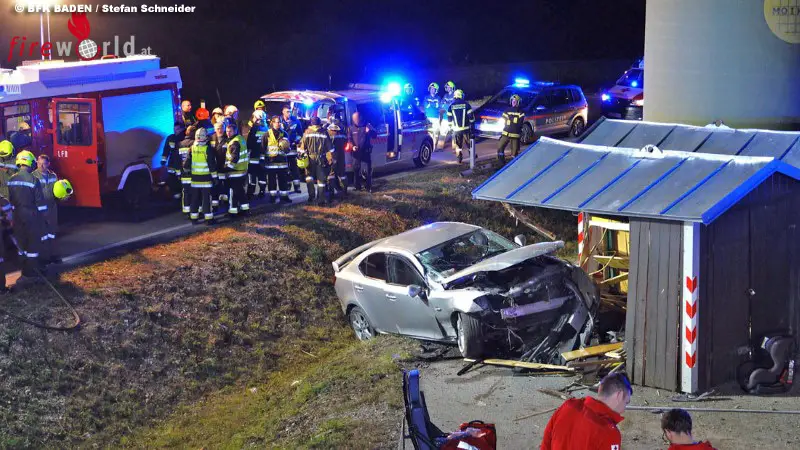 Kurz vor Mitternacht des 4. Oktober 2019 verunfallte der Lenker eines Lexus nahe der Bezirksgrenze. Den Unfallspuren zufolge kam der Pkw aus Richtung Sollenau kommend, als der Lenker die Herrschaft über das Fahrzeug verlor und von der Fahrbahn in den Straßengraben abkam. Infolge prallte der Pkw gegen die Böschung und schlug mit voller Wucht in eine Holzhütte der Straßenmeisterei ein bis dieser dort zum Stillstand kam. Der Lenker wurde dabei unbestimmten Grades verletzt und im deformierten Unfallwagen eingeschlossen.