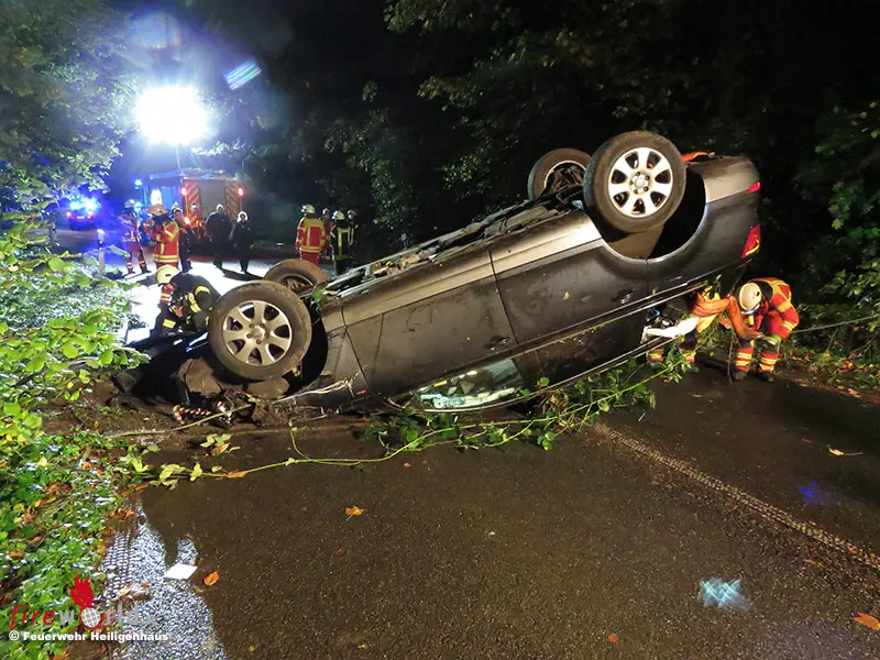 Bei dem Fahrmanöver verlor er die Kontrolle über das große SUV und kam mit dem Fahrzeug von der Fahrbahn ab. Das Fahrzeug stürzte mehrere Meter tief die dortige Böschung hinab, überschlug sich und blieb zwischen dichtem Buschwerk und jungem Baumbewuchs auf dem Dach liegen. Die alarmierten Rettungskräfte der Feuerwehr Heiligenhaus rückten mit schwerem Gerät zur Unfallstelle aus, da eine Person im Fahrzeug eingeklemmt war.