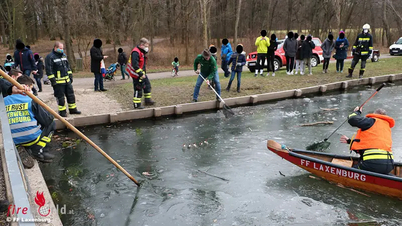LAXENBURG (NÖ): Am 24. Jänner 2021 wurde die Freiwillige Feuerwehr um 15.46 Uhr zu einer Tierrettung in den Schlosspark Laxenburg alarmiert. Vom zuständigen Parkwächter wurde man über acht Entenküken, welche sich im zugefrorenen Bereich des Forstmeisterkanals befanden, informiert.