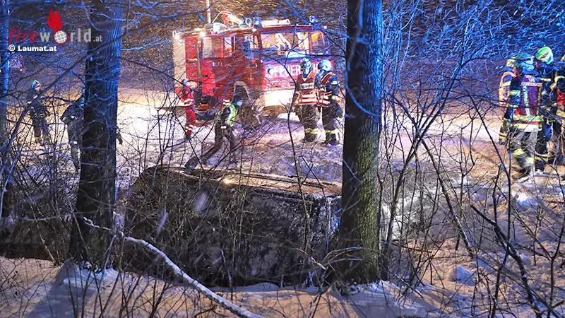 Eine Autolenkerin, die mitsamt ihren Kindern im Fahrzeug auf der Bergsleithenstraße bei Pettenbach unterwegs war, ist aus bisher unbekannten Gründen auf der schneeglatten Straße von der Fahrbahn abgekommen. Das Auto landete seitlich liegend im dortigen Fischlhamer Bach.