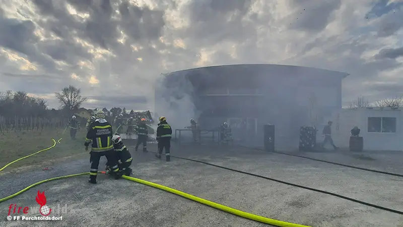 PERCHTOLDSDORF (NÖ): Um 14:53 Uhr des 27. März 2021 wurde die Feuerwehr Perchtoldsdorf zu einem Brand in einem Gewerbebetrieb in der Vierbatz Straße alarmiert. Beim Eintreffen der ersten Fahrzeuge stand ein Verkaufsstand vor der Betriebshalle in Vollbrand.