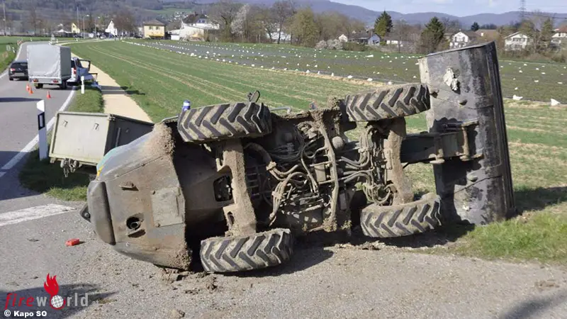 um 16.15 Uhr, wollte der Lenker eines landwirtschaftlichen Arbeitskarrens in Däniken von der Talhubelstrasse herkommend in die Löchlistrasse einbiegen. Dabei übersah er ein Auto mit Anhänger, welches von Safenwil herkommend auf der Löchlistraße in Richtung Däniken unterwegs war. Bei der Kollision zwischen den beiden Fahrzeugen drehte sich das landwirtschaftliche Fahrzeug um 180 Grad und kippte folglich