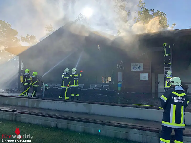 HÖFLEIN BEI BRUCK/LEITHA (NÖ): Am Sonntag, dem 13. Juni 2021, kam es in den Stunden des späten Nachmittags aus noch ungeklärter Ursache zum Brand des Kantinengebäudes am Sportplatz in Höflein bei Bruck an der Leitha.