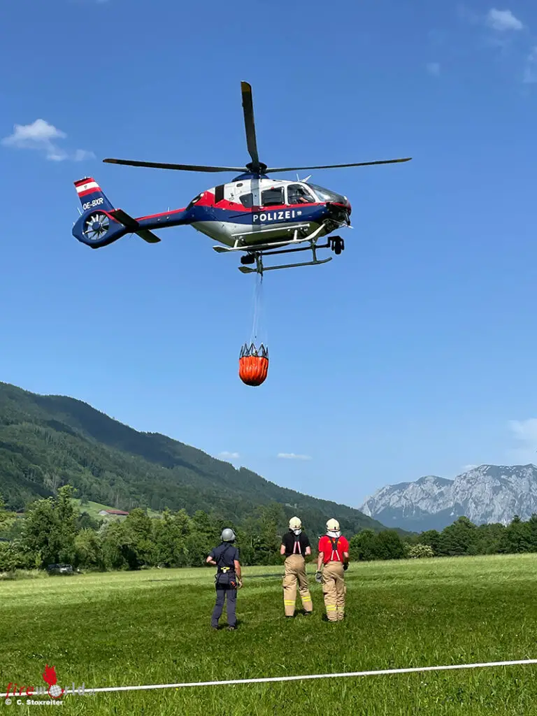 Die Waldbrandstützpunkte aus Sankt Agatha und Scharnstein unterstützen gemeinsam mit zwei Hubschraubern des Bundesministeriums für Inneres die Brandbekämpfung. Das Wasser wird aus dem Mondsee entnommen und auf den Berg geflogen.