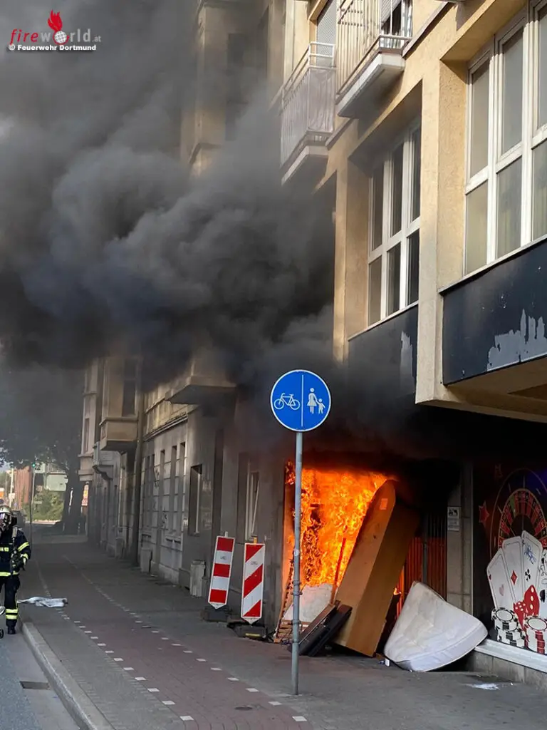 D: Auf dem Weg zu Autobrand brennenden Sperrmüll bei Wohnungseingang in Dortmund entdeckt