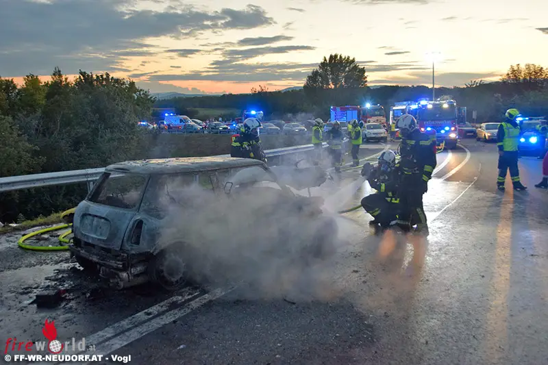 Bei Ankunft der für diesen Autobahnabschnitt zuständigen Freiwilligen Feuerwehr Wiener Neudorf stand der Mini entgegen der Fahrtrichtung in Vollbrand. Da durch die anwesende Autobahnpolizei bereits beide Fahrspuren für den Verkehr gesperrt waren, konnte die Feuerwehr unverzüglich mit der Brandbekämpfung beginnen. Zu diesem Zeitpunkt befanden sich keine Personen mehr im Gefahrenbereich.