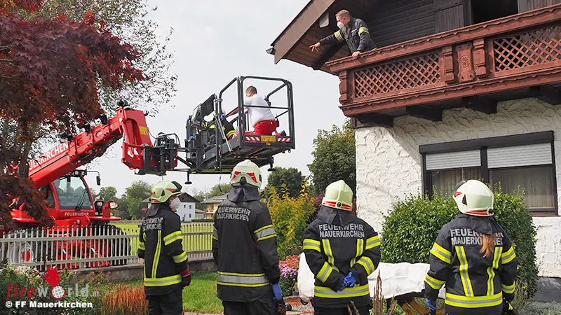 MAUERKIRCHEN (OÖ): Am Sonntag, 26. September 2021, wurde die Freiwillige Feuerwehr Mauerkirchen um 13:34 Uhr von der Landeswarnzentrale zur Unterstützung des Rettungsdienstes alarmiert. Unverzüglich rückten das Rüst-Lösch-, das Rüst-, und das Kommandofahrzeug dicht gefolgt vom Teleskoplader zur Einsatzstelle in der Geretsdorferstraße aus.
