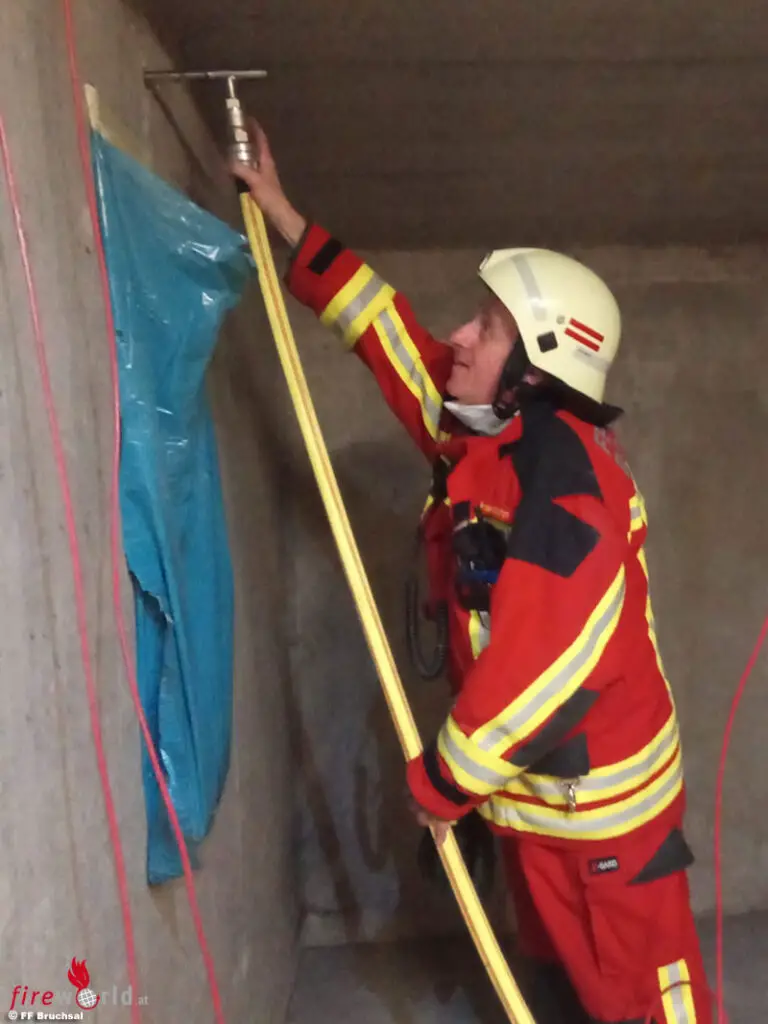 Es stellte sich heraus, dass zwischen der doppelten Betonwand Holzfaserplatten in Brand geraten sind. Mit zwei D-Rohren wurden mit den Löschlanzen Löschwasser mit Netzmittel zwischen die Wände eingespritzt, um den Brand zwischen den zwei Betonwänden zu löschen.