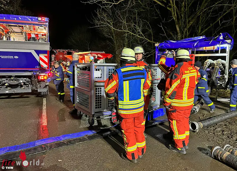 Seit Sonnabend, 20. Februar 2022, sind in dort enger Abstimmung mit der örtlichen Feuerwehr daher THW-Fachgruppen W/P aus Oldenburg in Holstein, Mölln und Bad Segeberg sowie eine weitere Pumpe der Feuerwehr Lübeck im Einsatz, um mit mehreren Hochleistungspumpen, und zusätzlichen Elektropumpen mit einer Dauerförderleistung von 45.000 l/Minute für Entlastung zu sorgen.