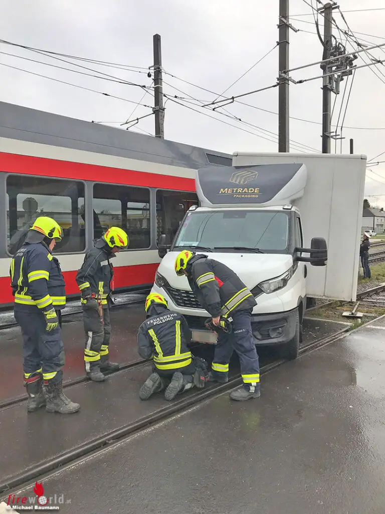ALKOVEN (OÖ): Die Kollision zwischen einer Garnitur der Linzer Lokalbahn und einem Klein-Lkw auf dem Bahnübergang beim Lagerhaus Alkoven endet am Morgen des 8. April 2022 glimpflich.