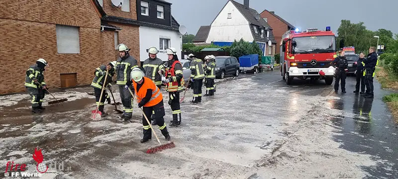 Durch den Regen wurde Erde von einem abschüssigen Feld auf die Stockumer Straße gespült. Durch die Wassermassen verteilte sich der Schlamm ca. 120m bis zur Einmündung Brachtstraße auf der gesamten Fahrbahn. Anwohner sowie ein Landwirt unterstützten die Säuberungarbeiten.