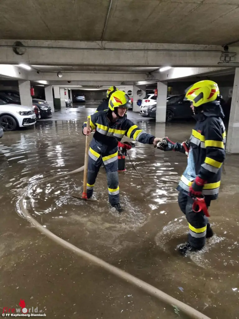 Die Einsatzmeldungen lauteten von „Keller unter Wasser“, „überflutete Straßen“, „Dach abgedeckt“, „Baum über Straße“, „Einkaufsmarkt überflutet“ bis hin zu „Tiefgarage unter Wasser“. Durch die Vielzahl an Schadenslagen standen alle sieben Feuerwehren der Stadt Kapfenberg im Einsatz.