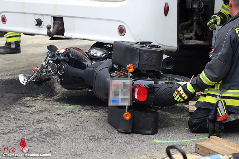 VÖCKLABRUCK (OÖ): Ein Motorradlenker wurde Mittwochvormittag, 22. Juni 2022, in Vöcklabruck bei einem Verkehrsunfall mit einem Schulbus, der gerade ein Stück zurücksetzen wollte, unter dem Bus eingeklemmt und dabei schwer verletzt.