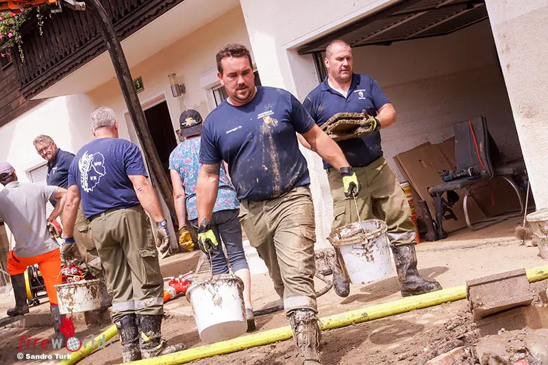 Dabei kann oftmals nur mit purer Manneskraft vorgegangen werden, um die Keller und die Wohnräume von den Geröll- und Schlammmassen zu befreien.