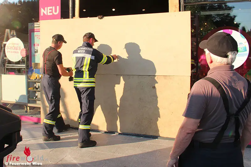 Um das Geschäft wieder „dicht“ zu bekommen, wurde die offene Fassade mit Holzplatten und Folie zugeschraubt bzw. verklebt. Die Feuerwehr Wies stand mit drei Fahrzeugen und zwölf Kameraden rund zwei Stunden im Einsatz.