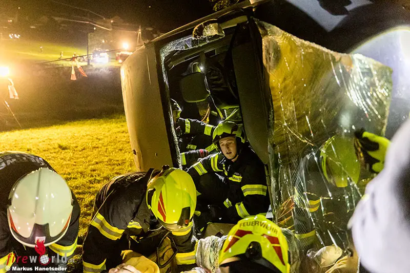 Oö: Schlepperfahrzeug schwer verunglückt → technische Alarmstufe II-Unfallübung mit fünf Eingeklemmten in Bad Schallerbach
