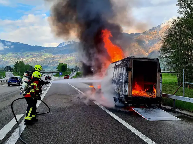 Schweiz: Lieferwagen geht nach Störungsmeldung und lautem Knall auf A 13 in Flammen auf