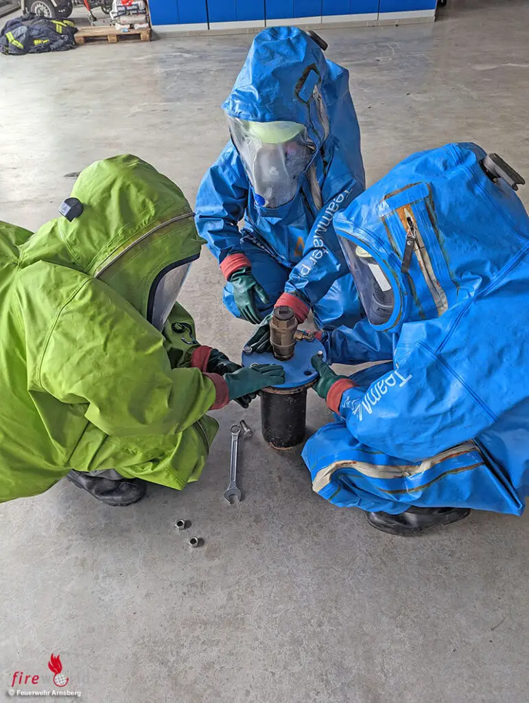Nachdem Lehrgangsleiter Werner Franke, stellvertretender Kreisbrandmeister im Hochsauerlandkreis, und Wehrführer Martin Känzler am Morgen des letzten Lehrgangstages die Prüfung abgenommen hatten, wurde zum Abschluss eine Übung gefahren. Beim Übungsszenario handelte es sich um eine Leckage an einem Kessel. Diese musste von den Kameraden/-innen abgedichtet werden. Es wurde ein realer ABC-Einsatz abgearbeitet.