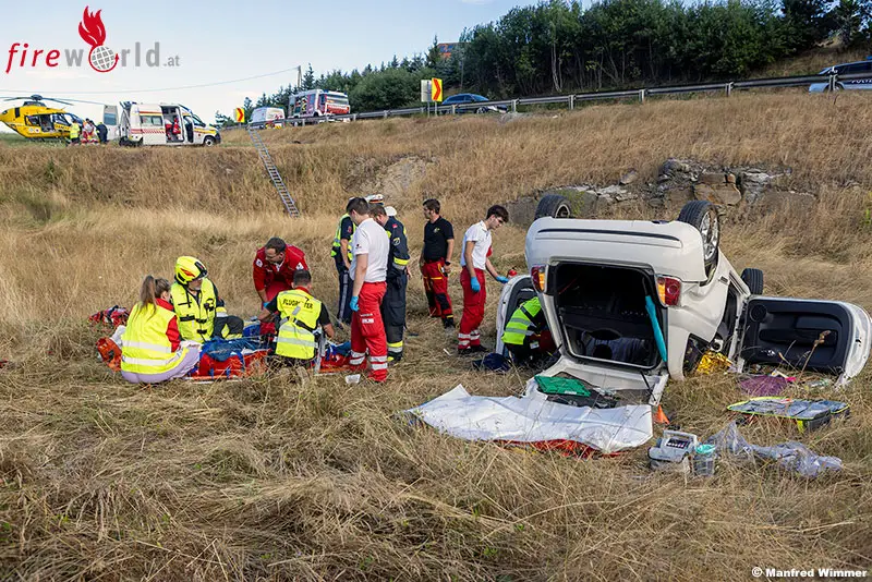 GFÖHL (NÖ): Ein schwerer Verkehrsunfall ereignete sich am Morgen des 28. Juli auf der B37 im Ortsgebiet von Gföhl. Ein in Fahrtrichtung Krems fahrender Kleinwagen, welcher mit drei Personen besetzt war, kam rechts von der Fahrbahn ab, touchierte ein Verkehrszeichen, rumpelte über eine Wiese und „sprang“ in ein großes, mehrere Meter tiefes Rückhaltebecken. Dort überschlug sich der Pkw und blieb am Dach liegen.