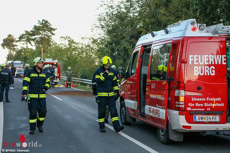 BURG (BGLD): Am 16. Oktober 2023 wurde die Freiw. Feuerwehr Burg 06:54 Uhr zu einem Verkehrsunfall mit verletzten Personen auf die L244 zwischen Burg und Hannersdorf alarmiert. Die ersteintreffende Feuerwehr fand einen verunfallten Kleintransporter vor, der über die Leitplanke geschleudert wurde und seitlich zum Erliegen kam.