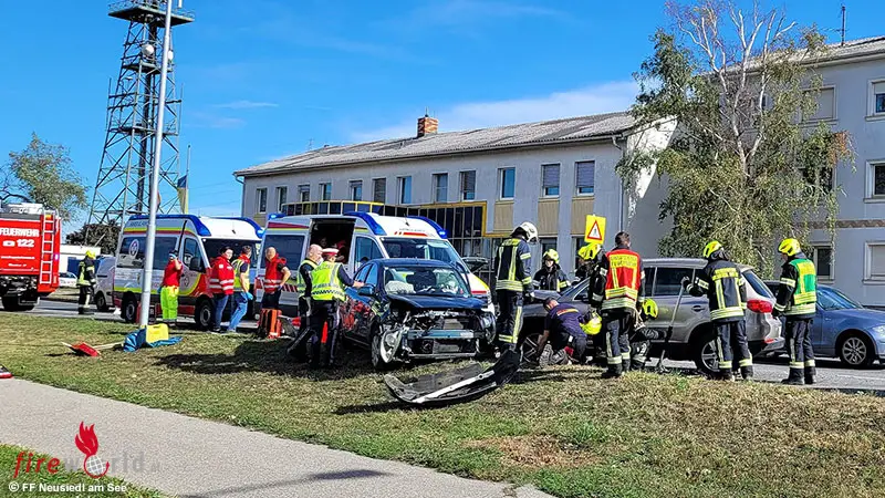 NEUSIEDL AM SEE (BGLD): Am 21. Oktober 2023 um 11:45 Uhr wurde die Feuerwehr Neusiedl am See zu einem schweren Verkehrsunfall im Ortsgebiet alarmiert. Beim Eintreffen wurde die eingeklemmte Lenkerin im blauen Auto bereits vom Rettungsdienst und den First Respondern aus dem Fahrzeug gerettet und in weiterer Folge im Rettungswagen erstversorgt.