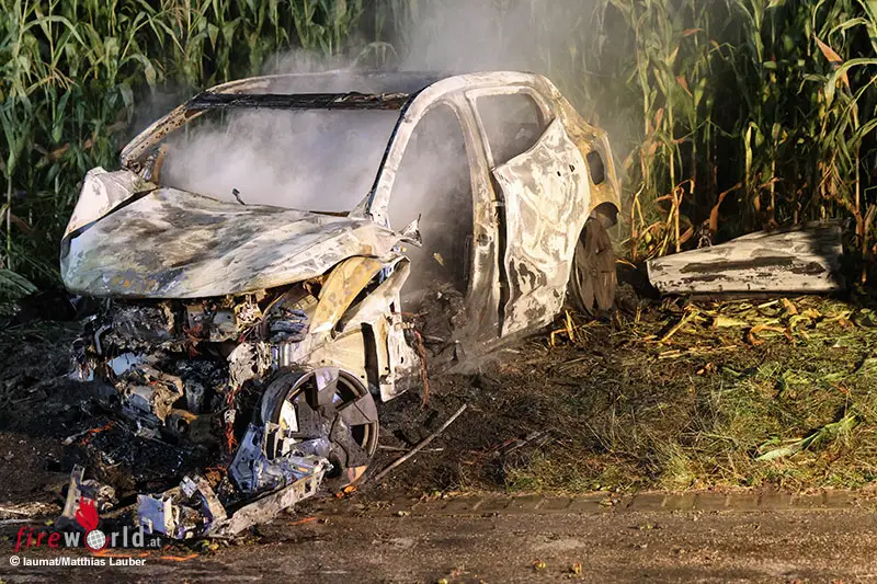 Die Einsatzkräfte der Feuerwehr wurden anfangs zu einem Brand mit unklarer Lage alarmiert, nachdem aus einiger Entfernung ein Feuerschein gemeldet wurde. Beim Eintreffen am Einsatzort wurde dann der massiv in Vollbrand stehende und offensichtlich verunfallte Pkw vorgefunden. Die Einsatzkräfte befürchteten bereits das Schlimmste: Im ausgebrannten Wrack entdeckten sie dann zwei verbrannte Personen.